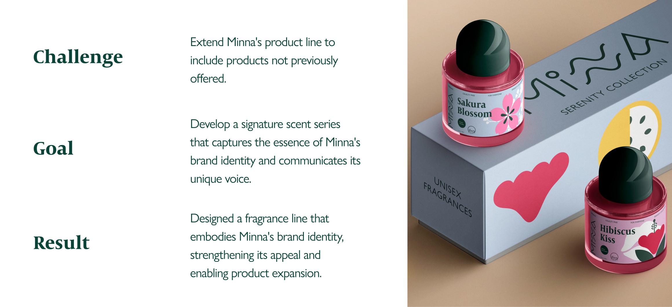 Expanding on Minna, an established brand renowned for its sparkling teas made with organic ingredients, this project introduced a fragrance line featuring candles, unisex perfumes, and lotions. The focus was on designing cohesive products and packaging that seamlessly aligned with Minna’s identity while appealing to both existing and new customers.